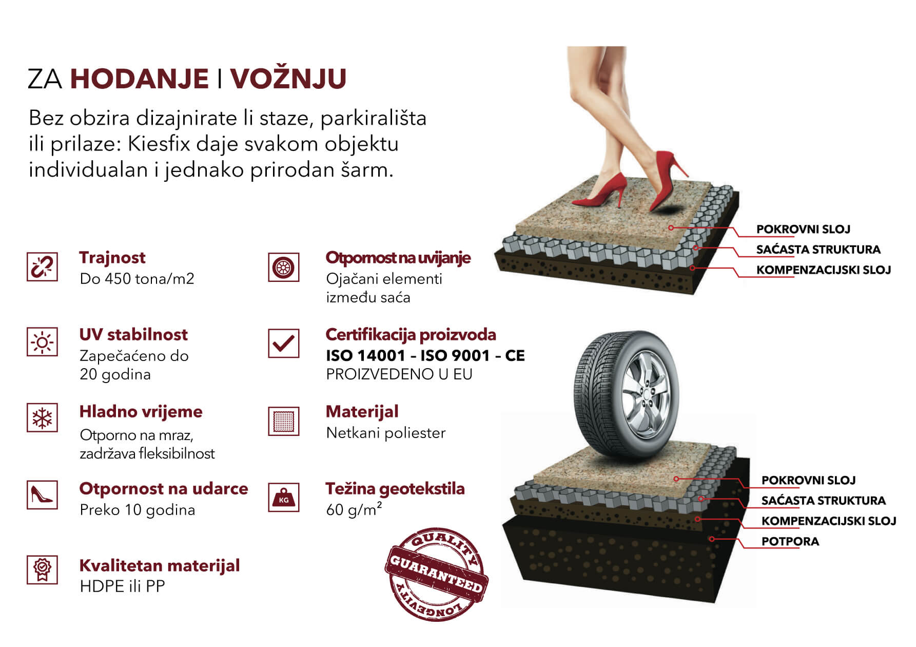MAKS Kiesfix sustav omogućuje prirodnu infiltraciju kišnice u tlo, čime se sprječava stvaranje lokvi i površinsko zadržavanje vode. Ova propusna struktura doprinosi održivom upravljanju oborinskim vodama i očuvanju prirodne ravnoteže tla.